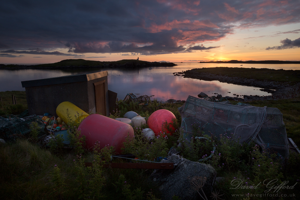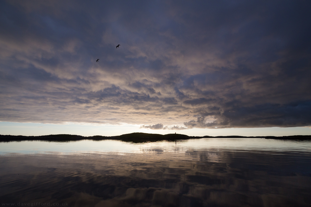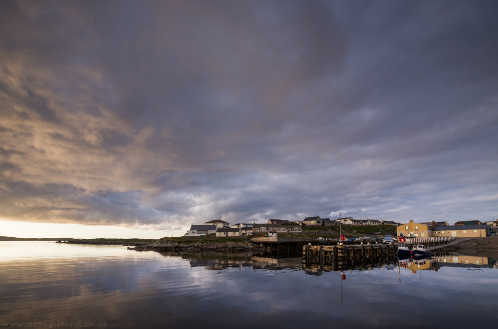 The first of a series of four photos taken on a beautiful evening at Hamnavoe, Burra. In this peaceful photo, you can see the silhouette of the Fugla Ness lighthouse, which guards the entrance to the harbour.