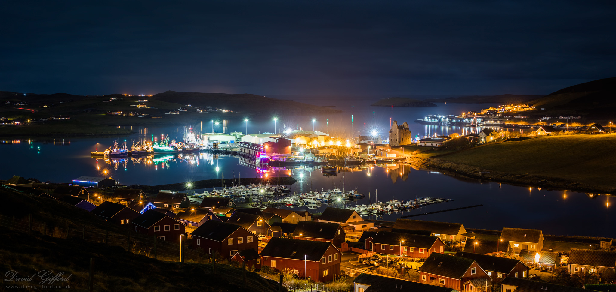 A colourful scene with Scalloway lit up at night. Some of the fishing boats are decorated with Christmas lights, adding to the festive atmosphere.