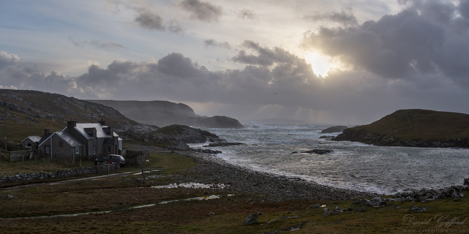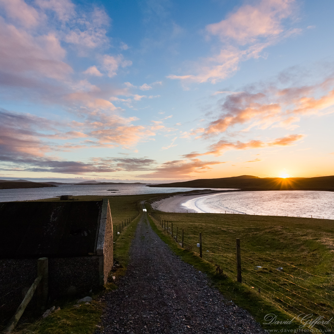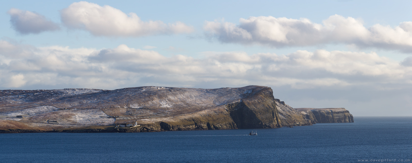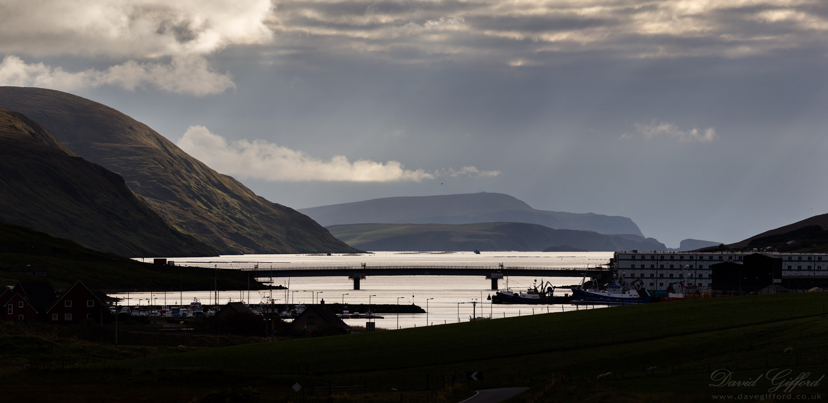 View looking south to the Trondra bridge, with Clift Sound and Fitful Head in the background. On the right is an accommodation barge at Scalloway, housing temporary workers for construction work at Sullom Voe.