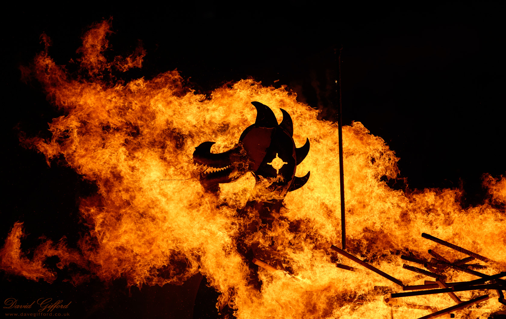 The galley on fire, with the flames revealing a motif hidden within the galley head.