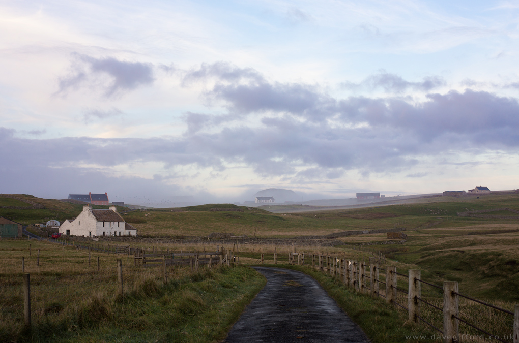 To give a few examples, in the foreground next to the road is the Walli Burn. And in the background, peeping out from the mist, is Sheep Rock.
