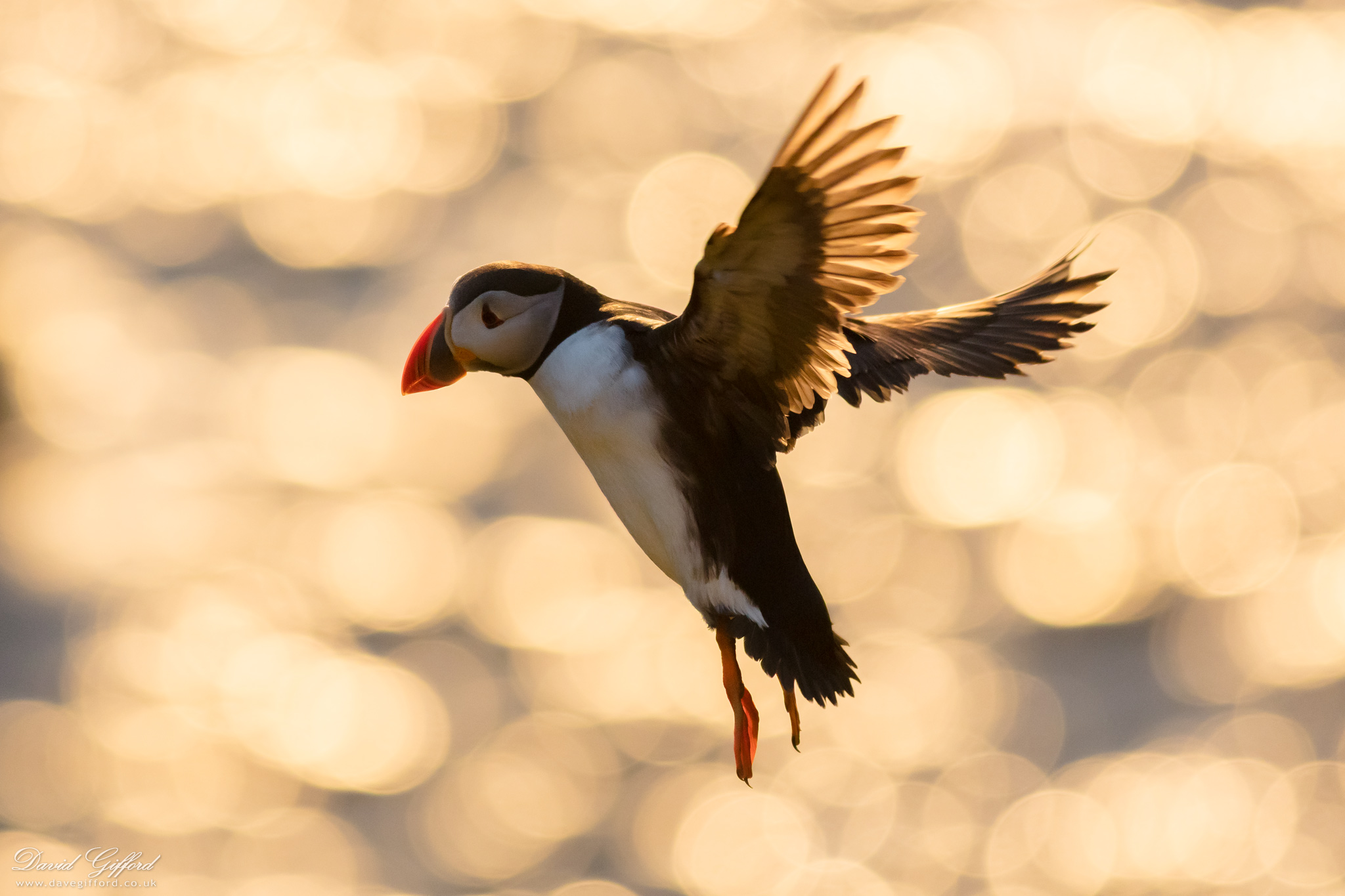 Golden Puffin A Puffin coming in to land, backlit by glistening sea in the evening sun.Posted: July 7th, 2019BirdPuffinShetland♦Image #990