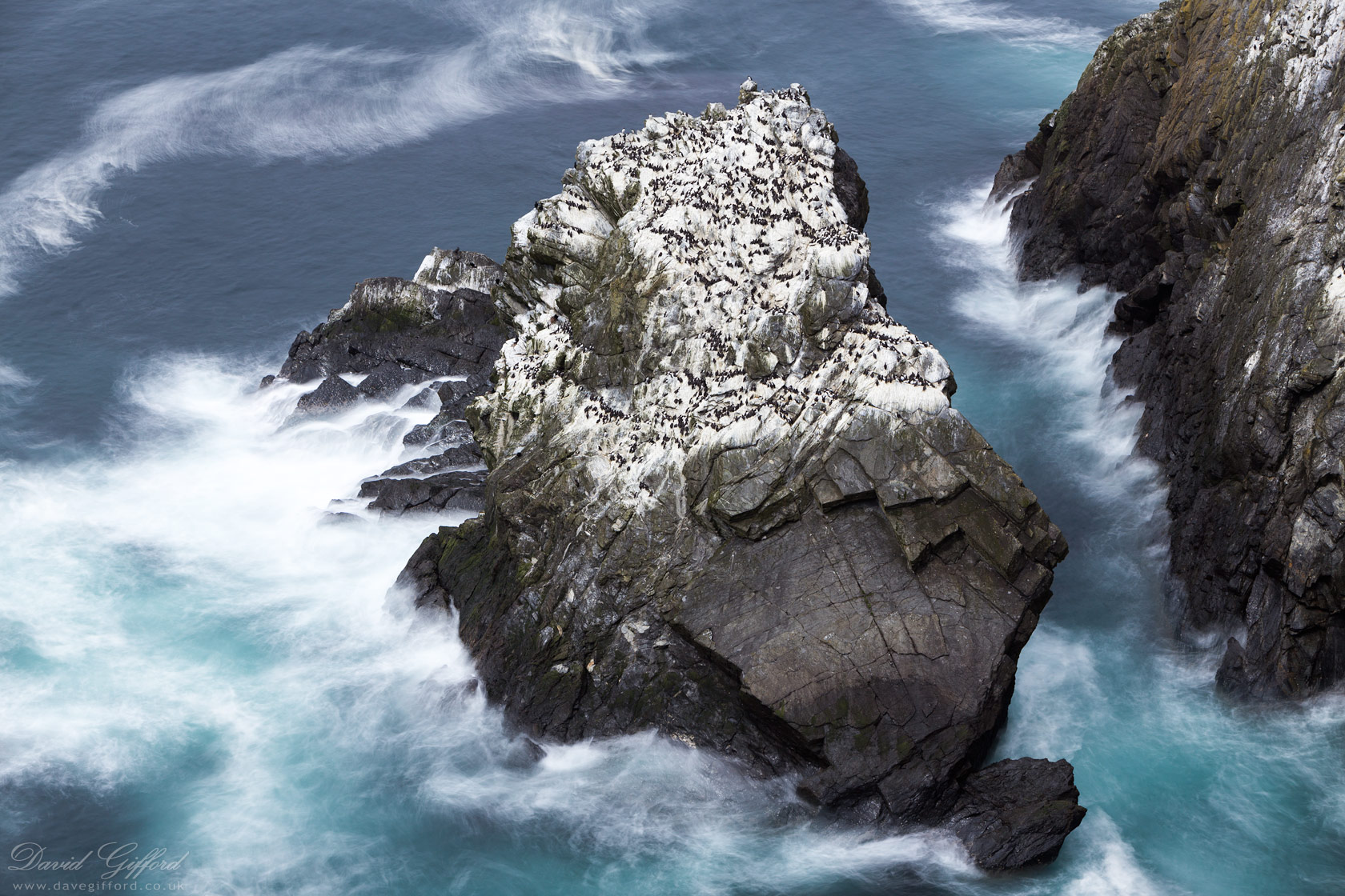 Guillemot colony on a stack at the Broad Geo of Smithfield, Sumburgh Head. You can watch live video of this colony and sourrounding cliff faces on the Shetland Webcams Cliff Cams.