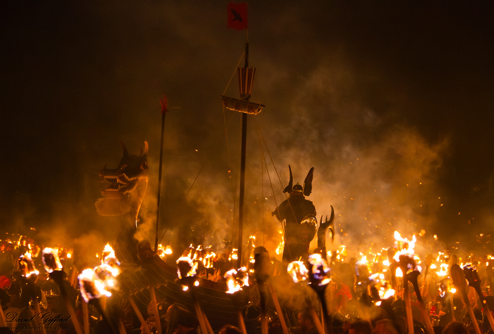 Just after the light-up, Guizer Jarl David Nicolson looks out over the crowds and torchlit procession from his vantage point in the galley - surely an extraordinary experience.