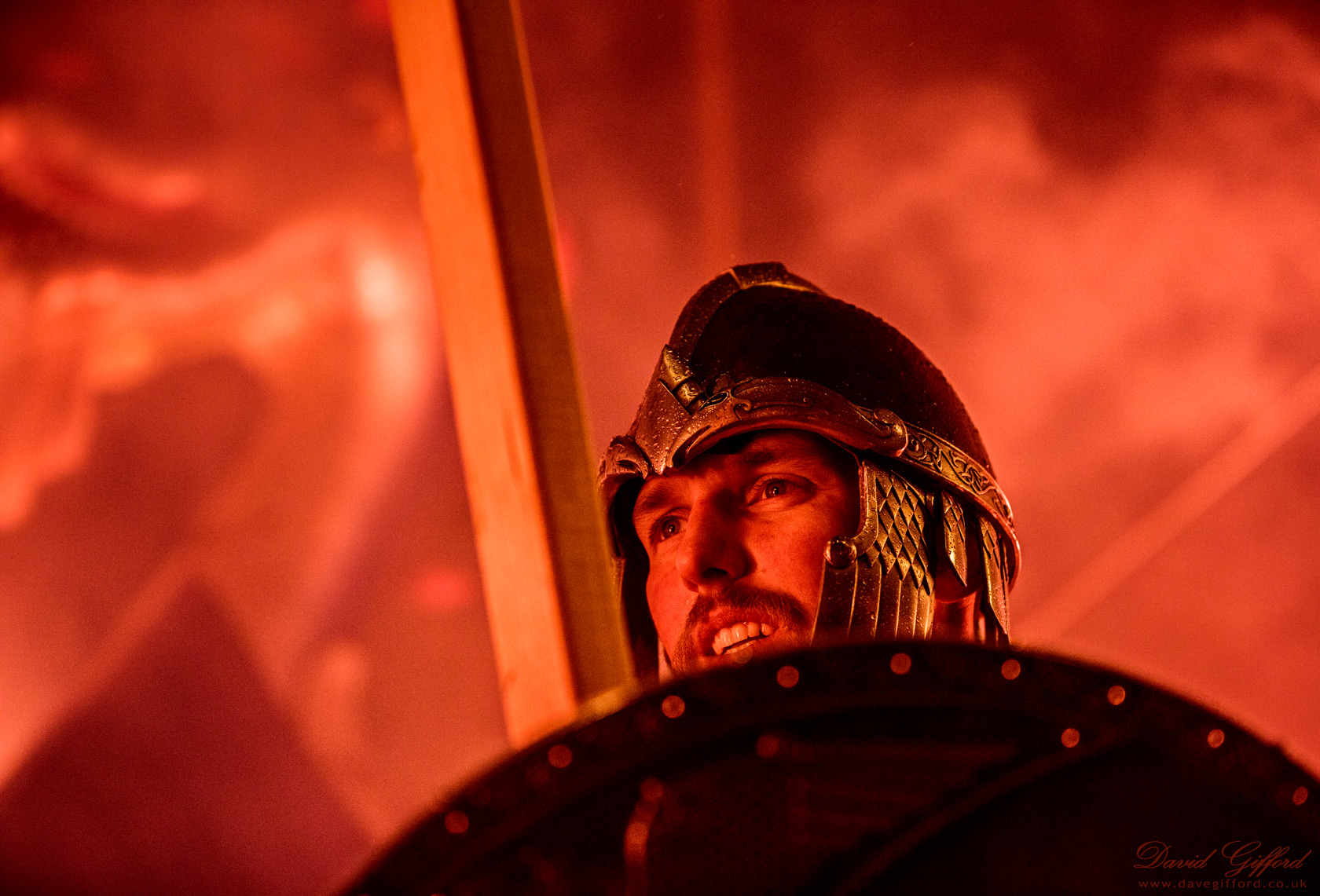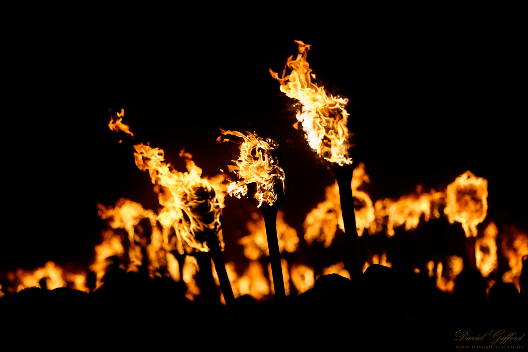 Guizer Jarl Stewart Jamieson, representing Thorvald Thorvaldsson, atop his galley, with the yellow flames of the procession reflected on the rain-spattered shield and axe.