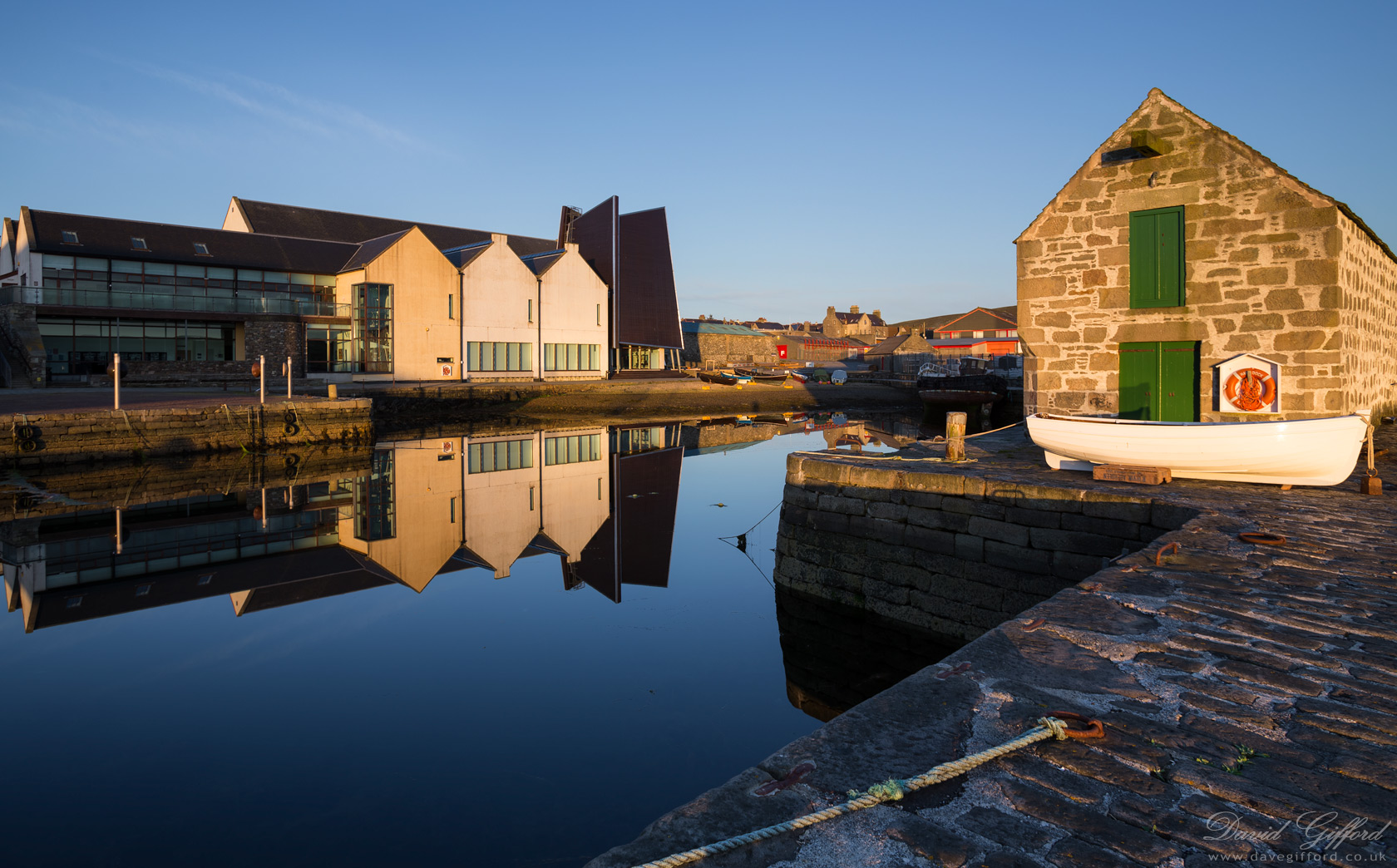 The Shetland Museum and Archives building reflecting in the sea at Hay's Dock. The dock was restored during the construction of the new museum and is category B listed.