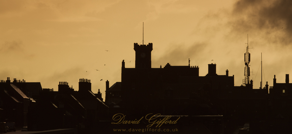 A silhouette of roofs in Lerwick, with the distinctive outline of the Town Hall at the top of the hill.