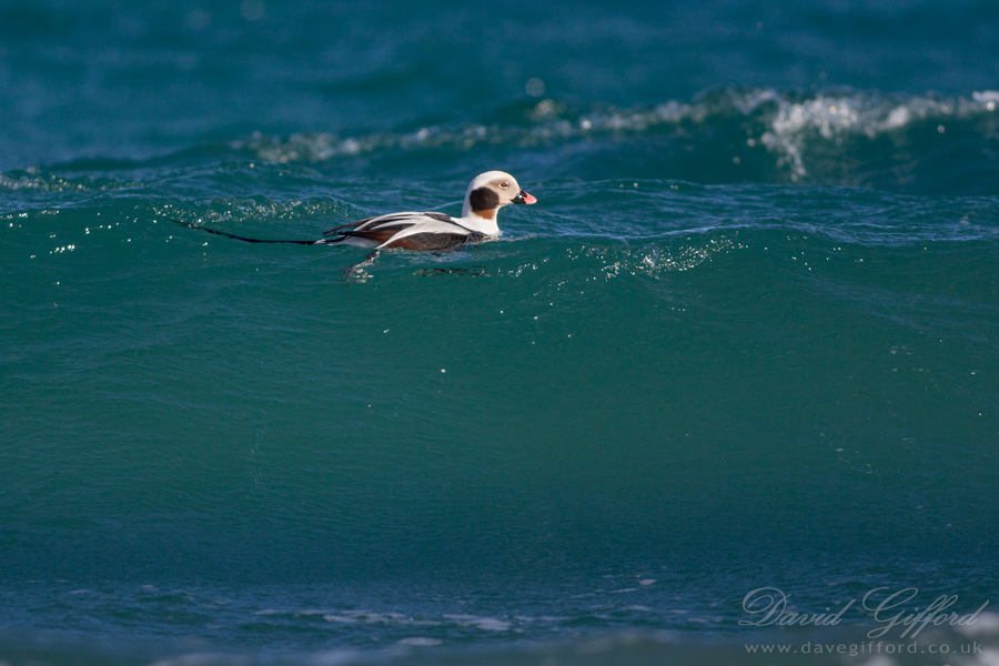The sun shining through the waves as this Long-tailed Duck, resplendent in it’s winter plumage, rides the swell.