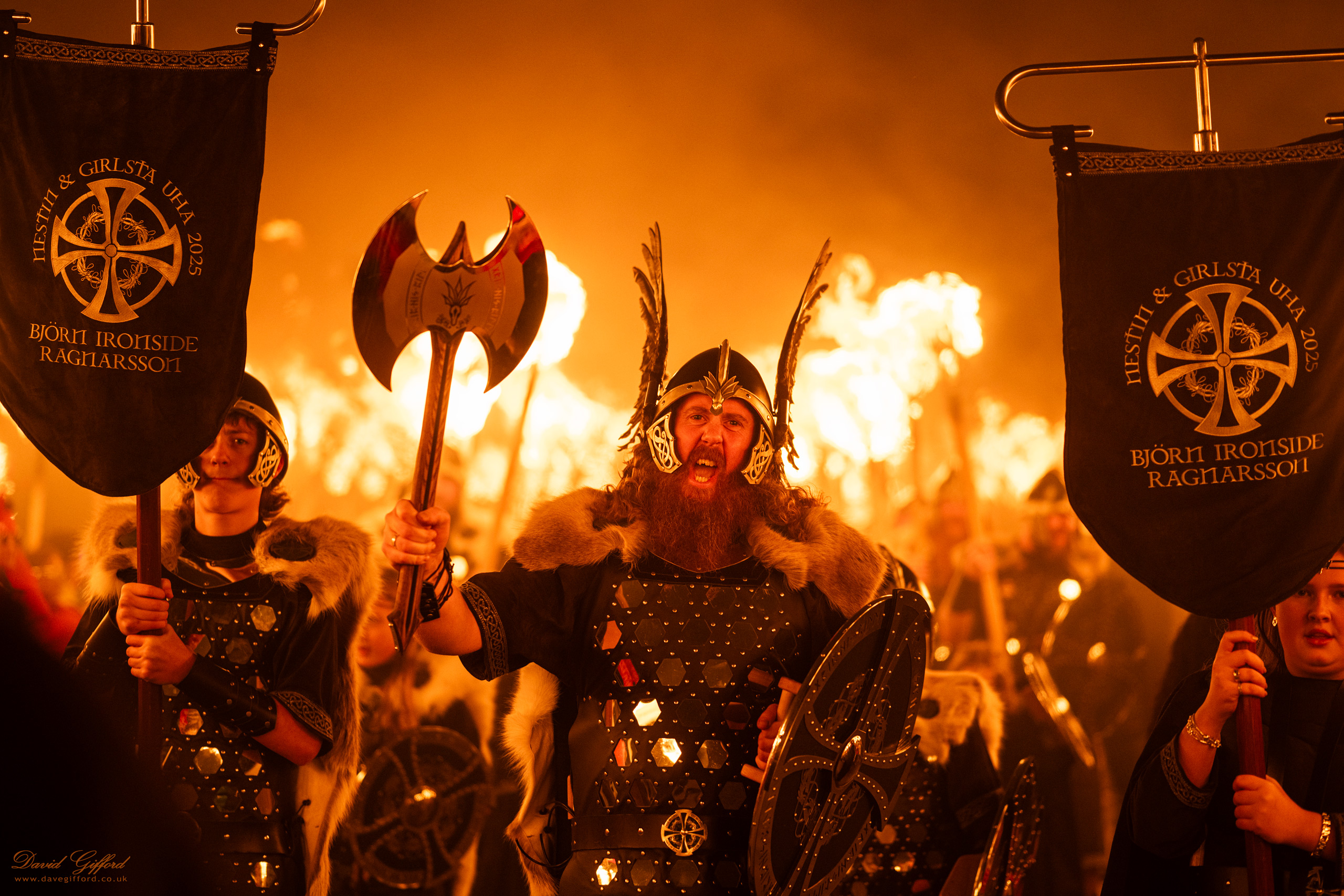 Guizer Jarl Scott Johnson leading his squad. Scott chose to portray Björn ‘Ironside’ Ragnarsson, son of the legendary Viking king Ragnar Lodbrok (and famous more recently from the Vikings television series).
