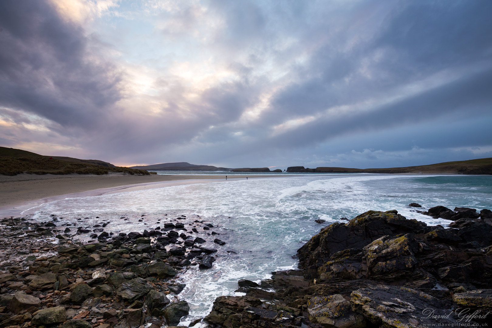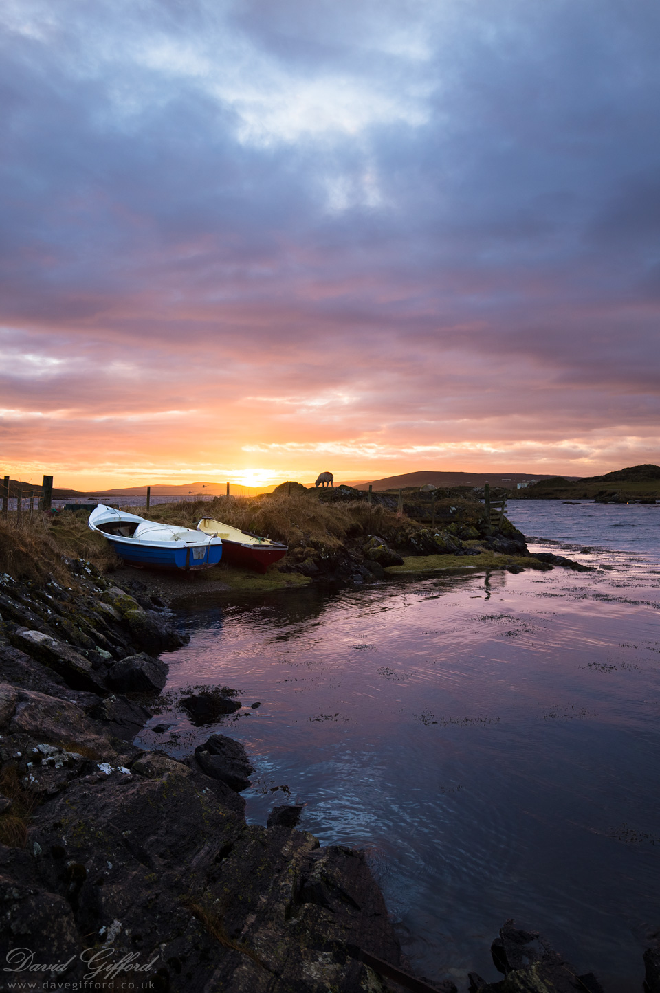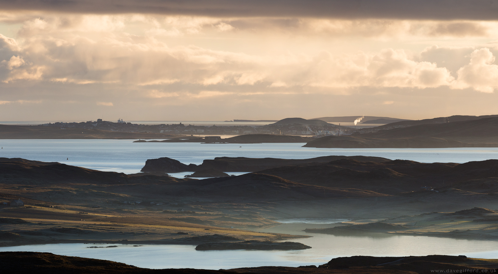 An atmospheric haze over Nesting (from peat reek) on a calm December day. The view is looking south to Lerwick, with Mousa in the far distance.
