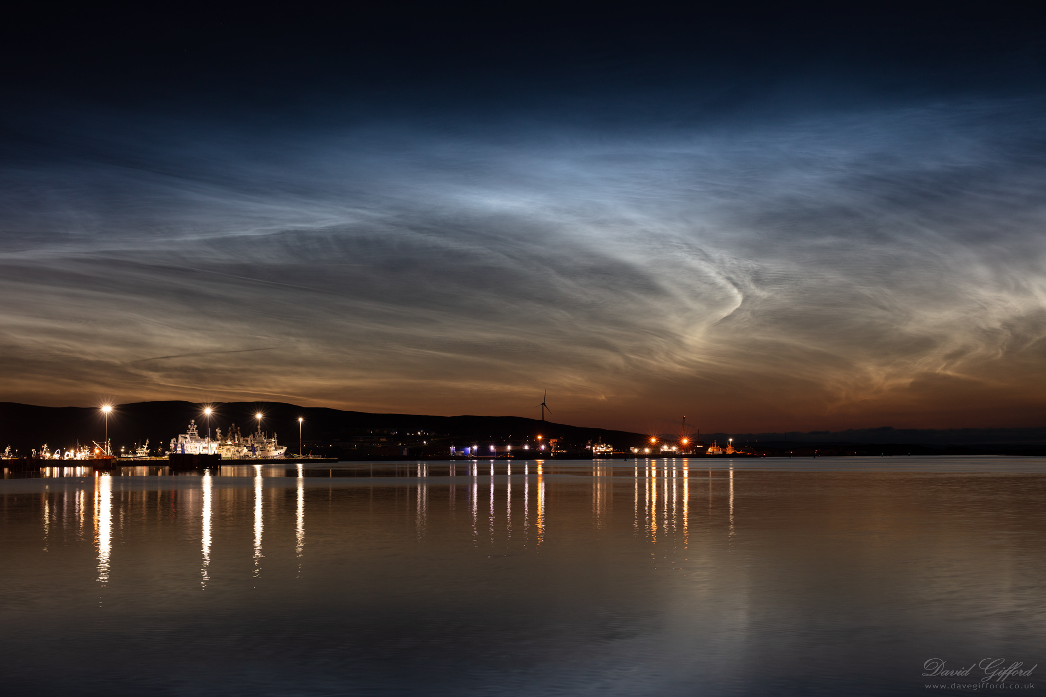 Rare noctilucent (“night-shining”) clouds photographed in the night sky looking north from Lerwick.