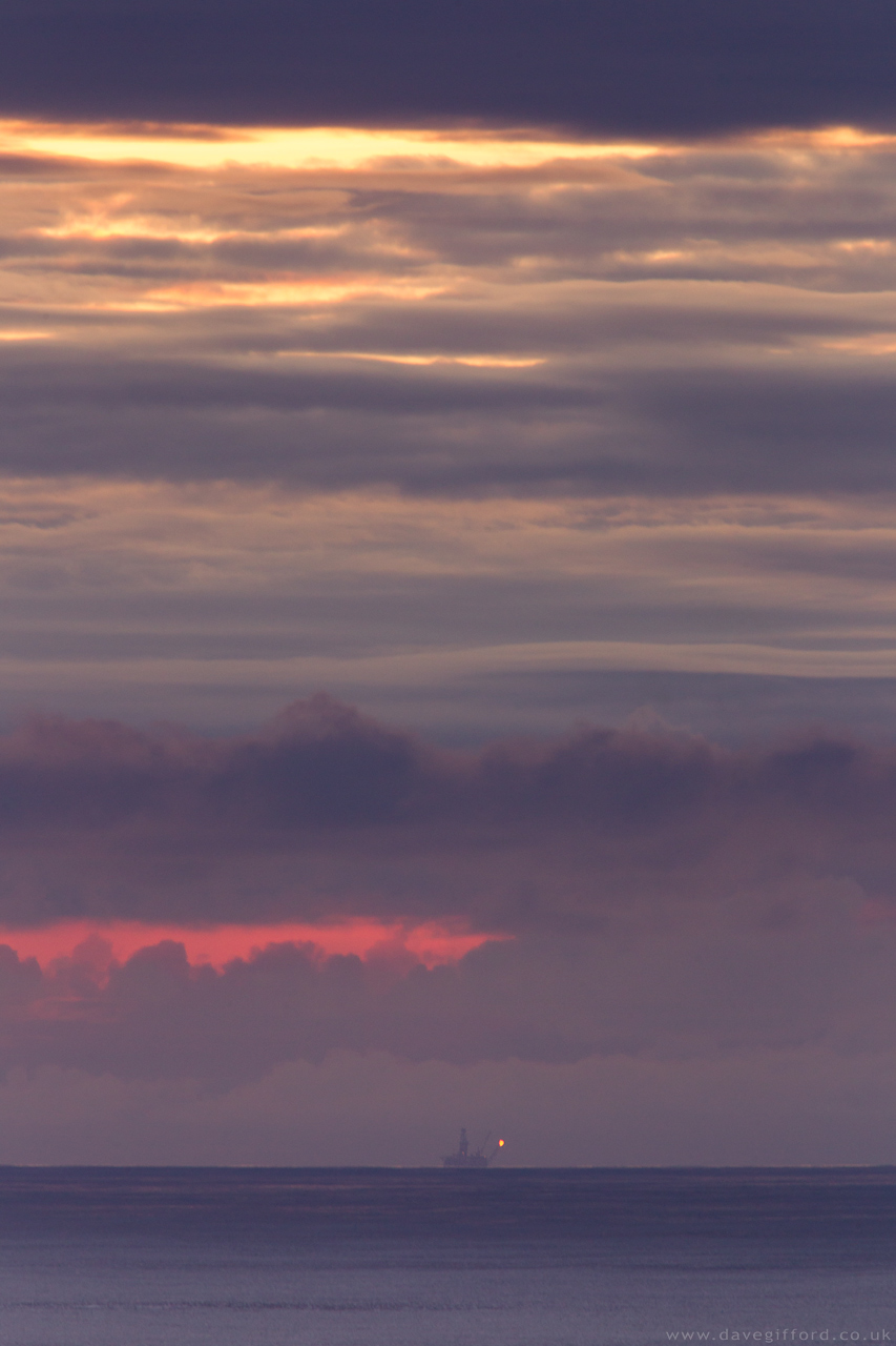 Oil platform and flare stack on the horizon, photographed from land in Shetland. I think this may be the BP Clair Phase 1 platform, located approximately 47 miles west of Shetland.