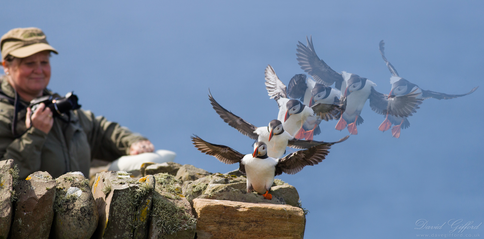 Just to explain about the photo… It’s made up of six individual exposures, all captured within a split second of one another (at ten frames per second). The final frame in the sequence, with the puffin on the dyke, included the photographer at the left-hand side. I made a similar image a few years ago, ‘Papagaaiduiker’, with a faster moving puffin (and a slower camera).