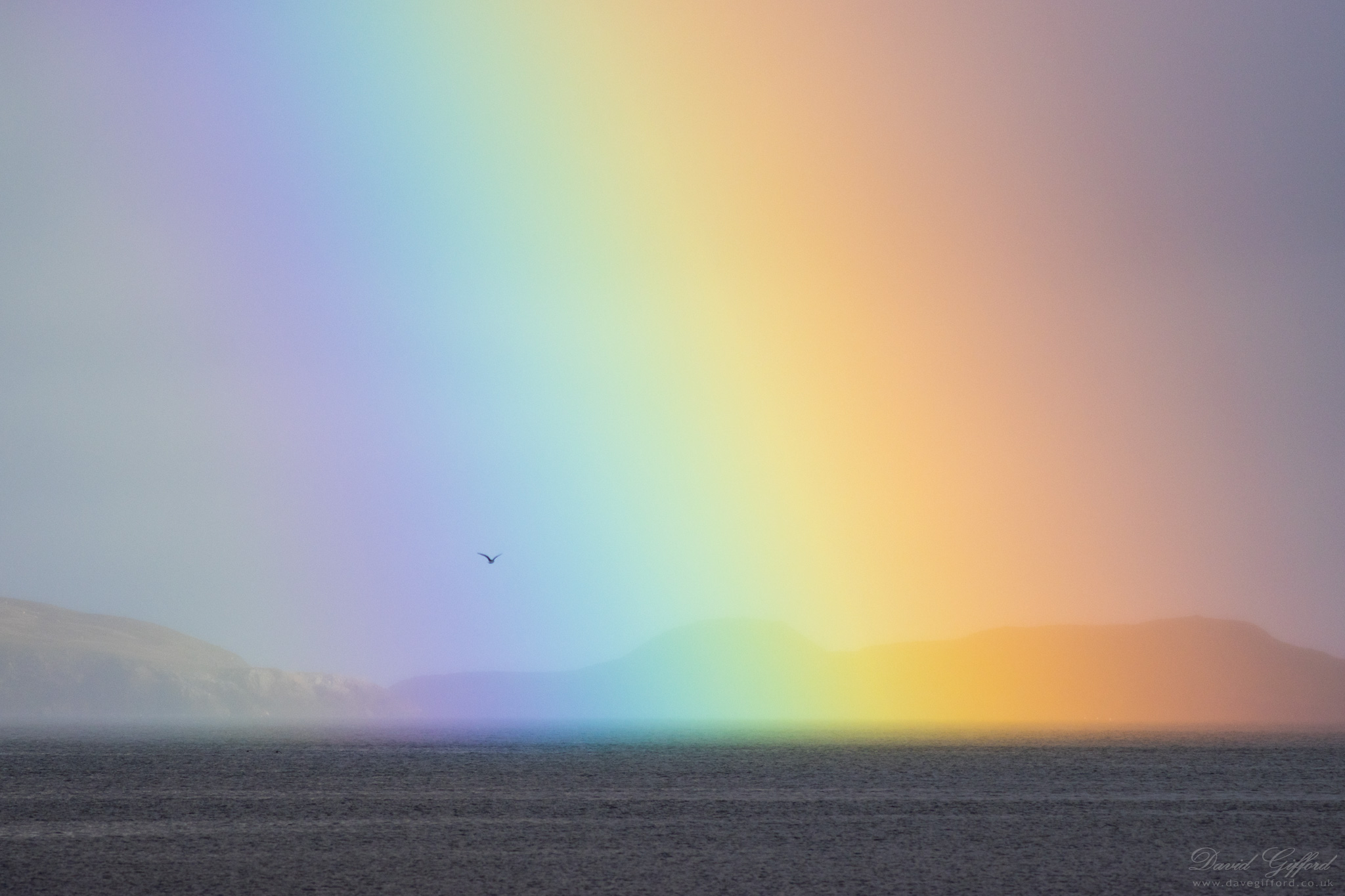 Light from the sun refracted by a rain shower over Shetland into a spectrum of colour, before passing into my camera lens.