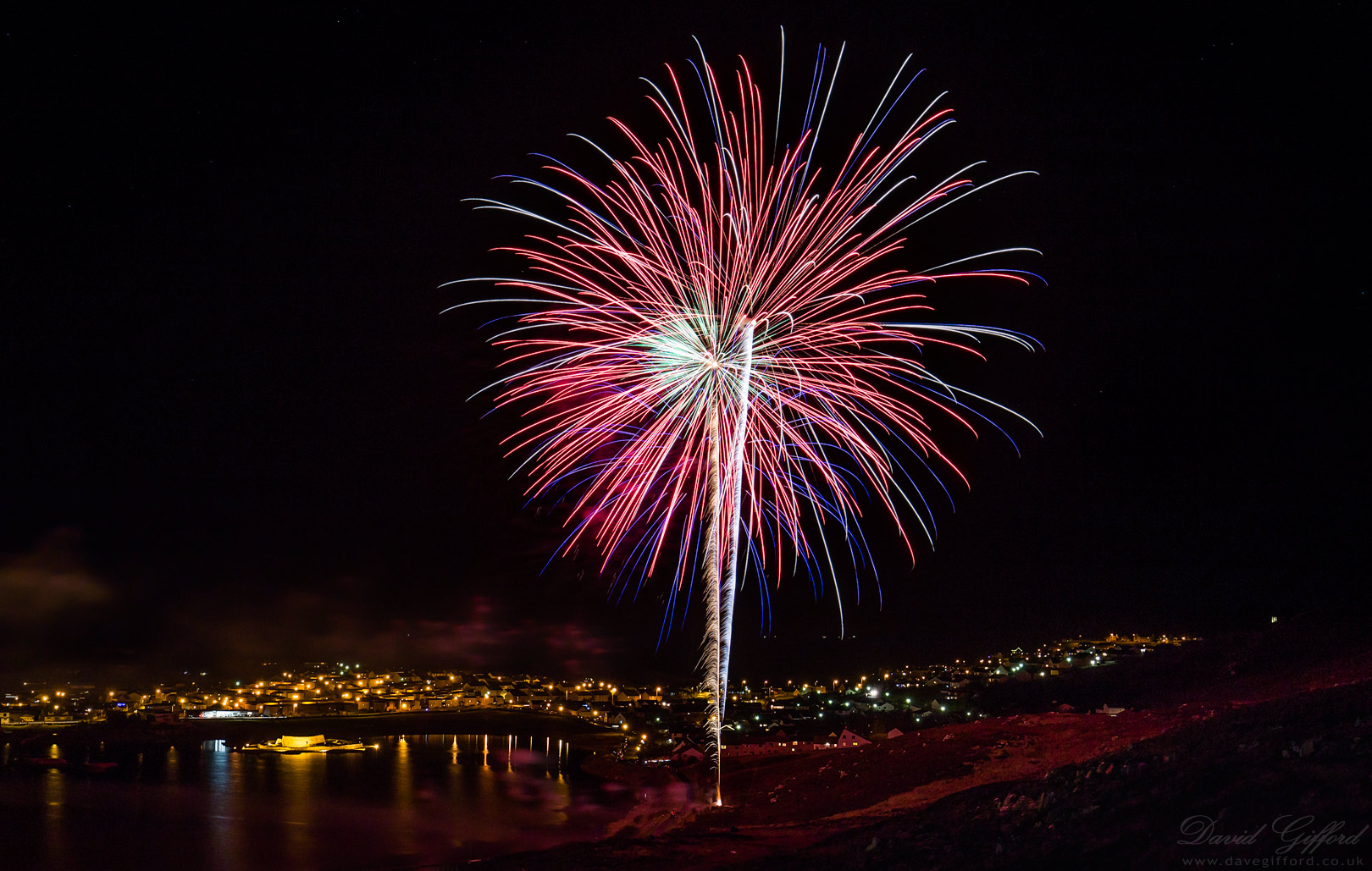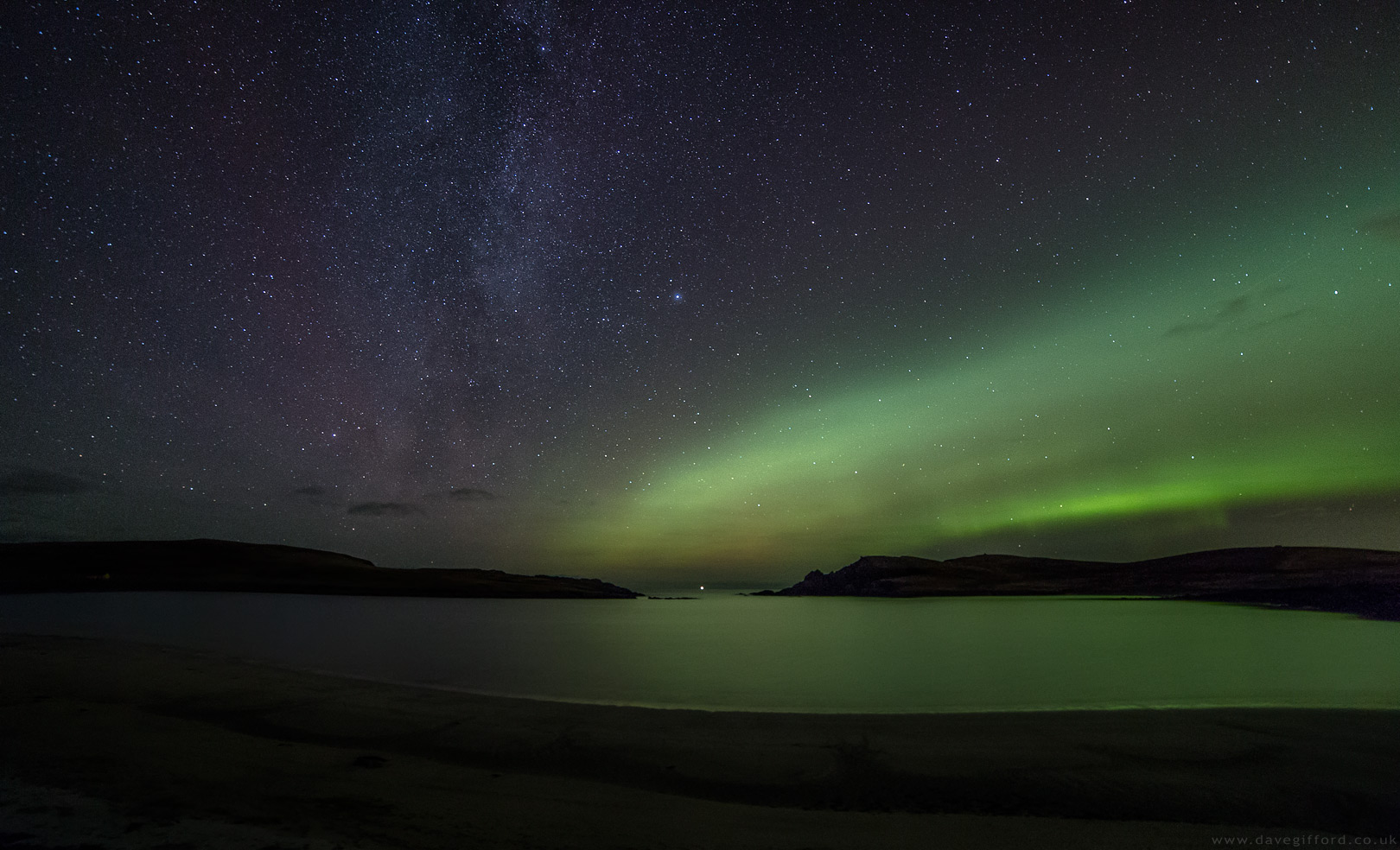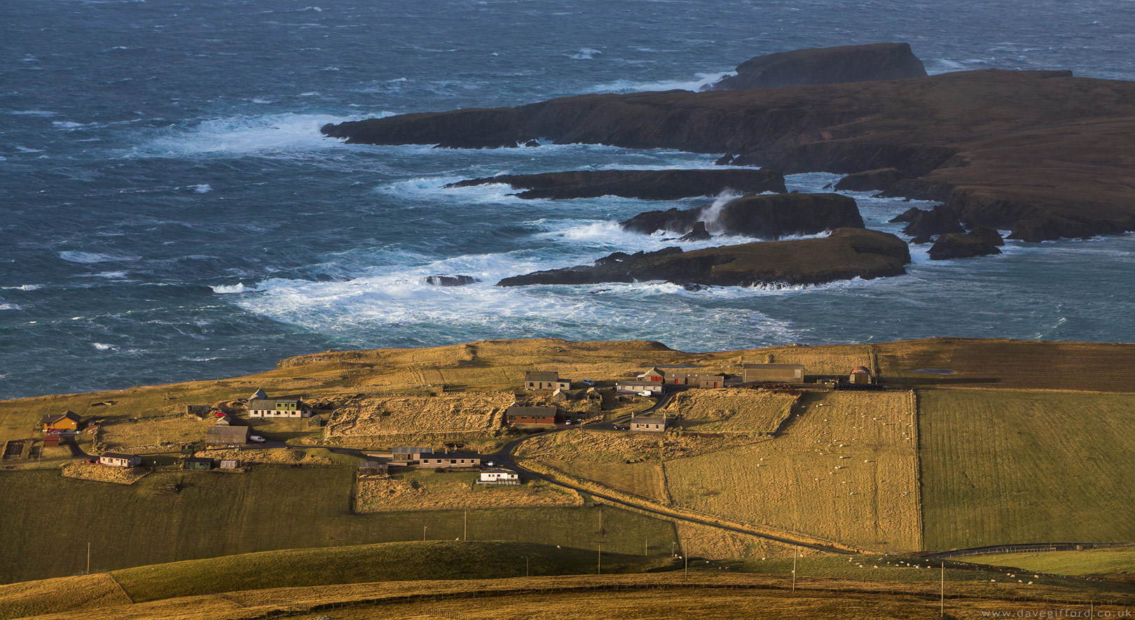 A glimpse of sunshine on the houses and farm buildings at Rerwick, with waves from the strong winds crashing into rocks at the south of St Ninian’s Isle.