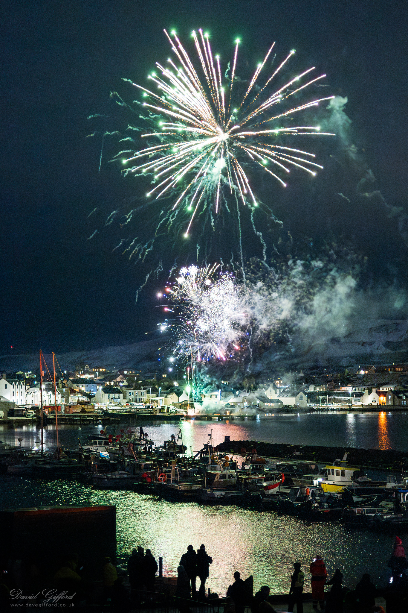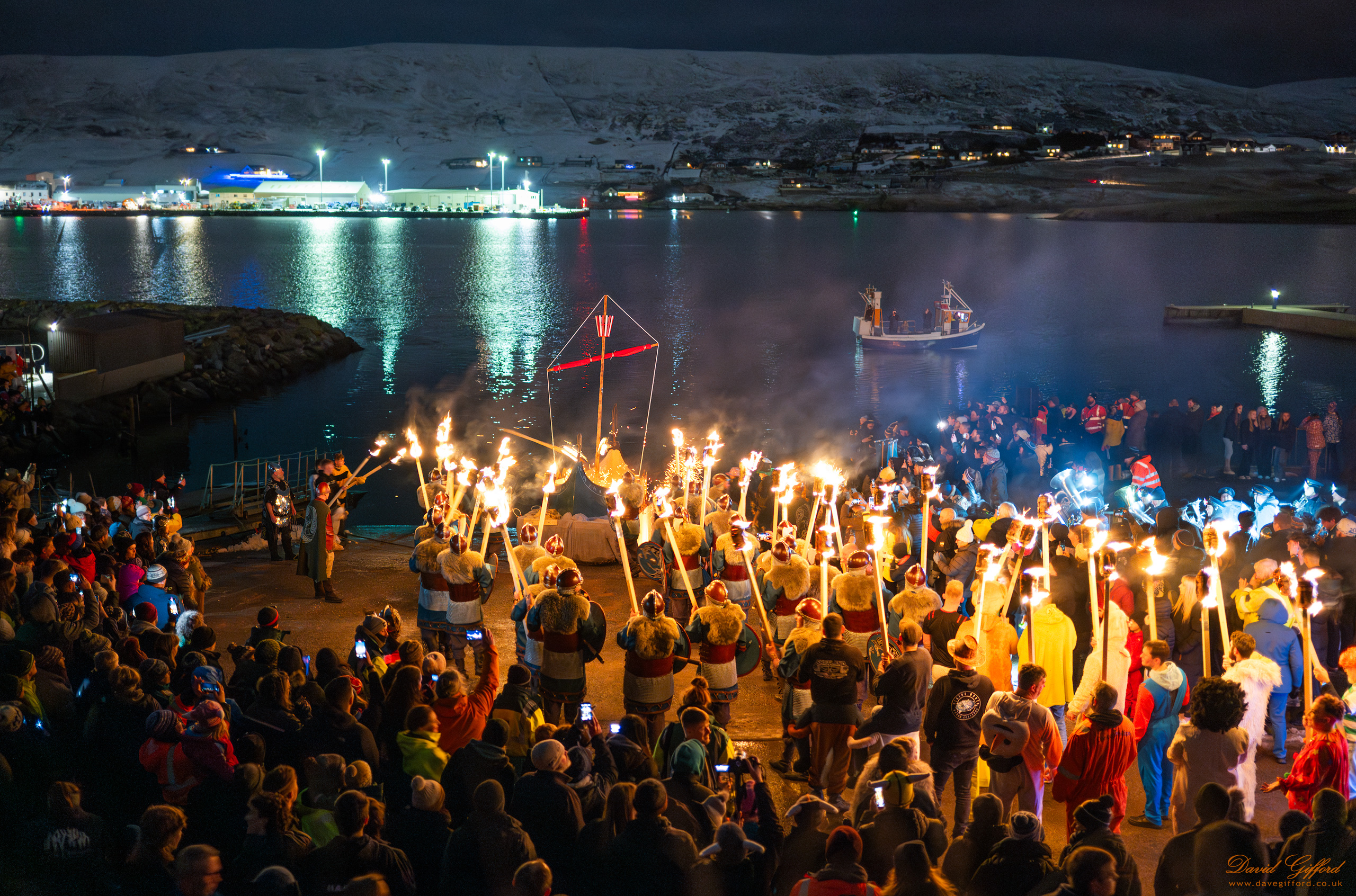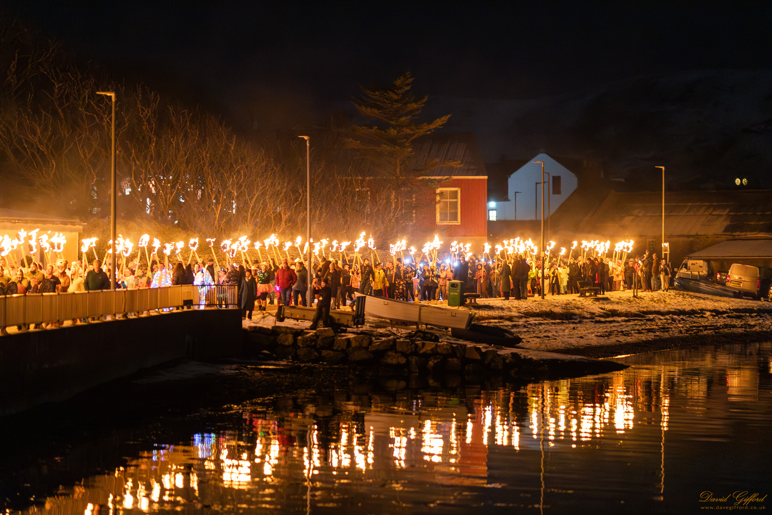 A fine night for the 2025 Scalloway Fire Festival; the burning torches reflecting in the calm sea at Westshore.