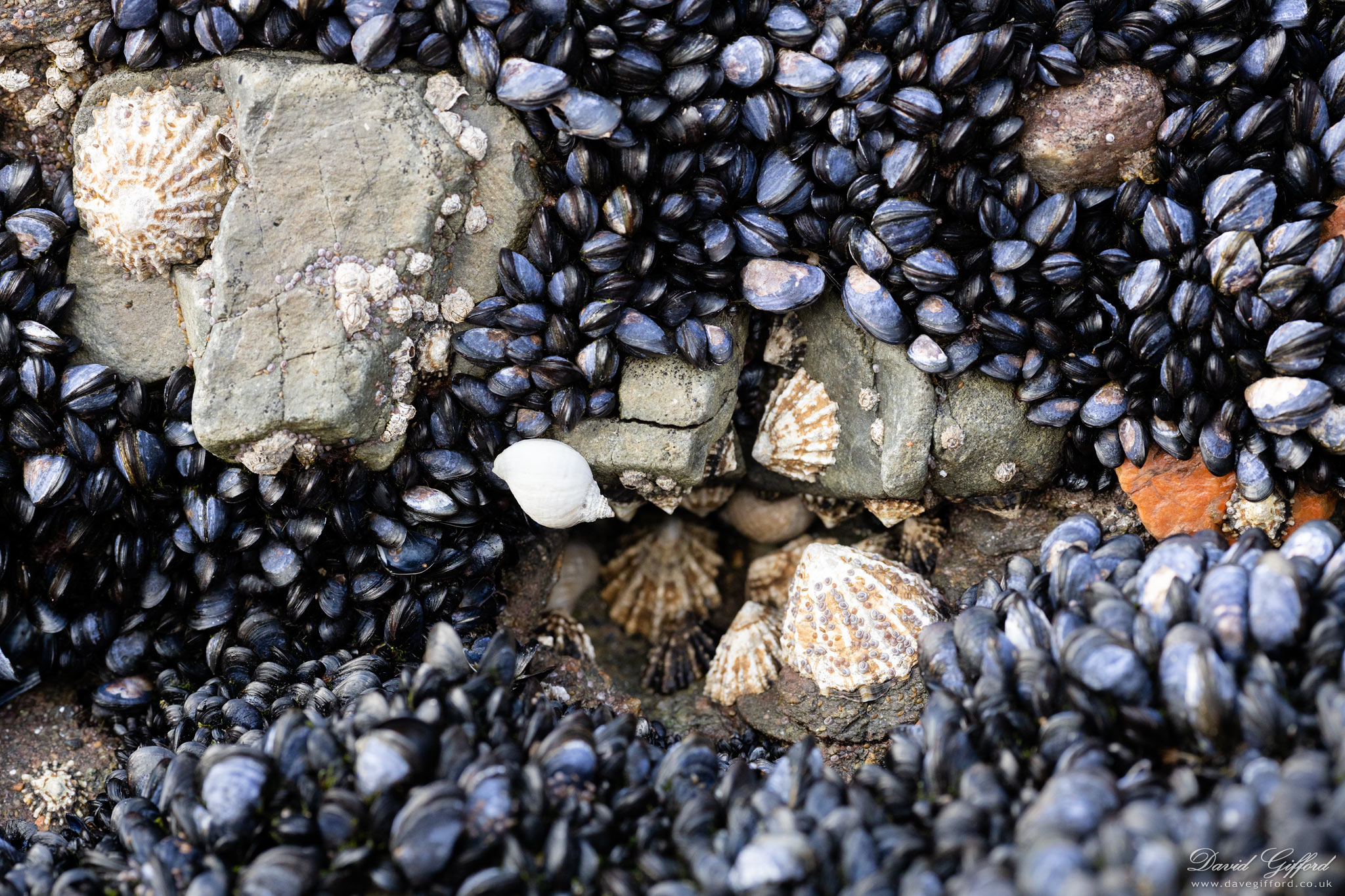 A fight for space on the rocks, with Blue Mussels, Limpets, Barnacles, and a Dog Whelk.
