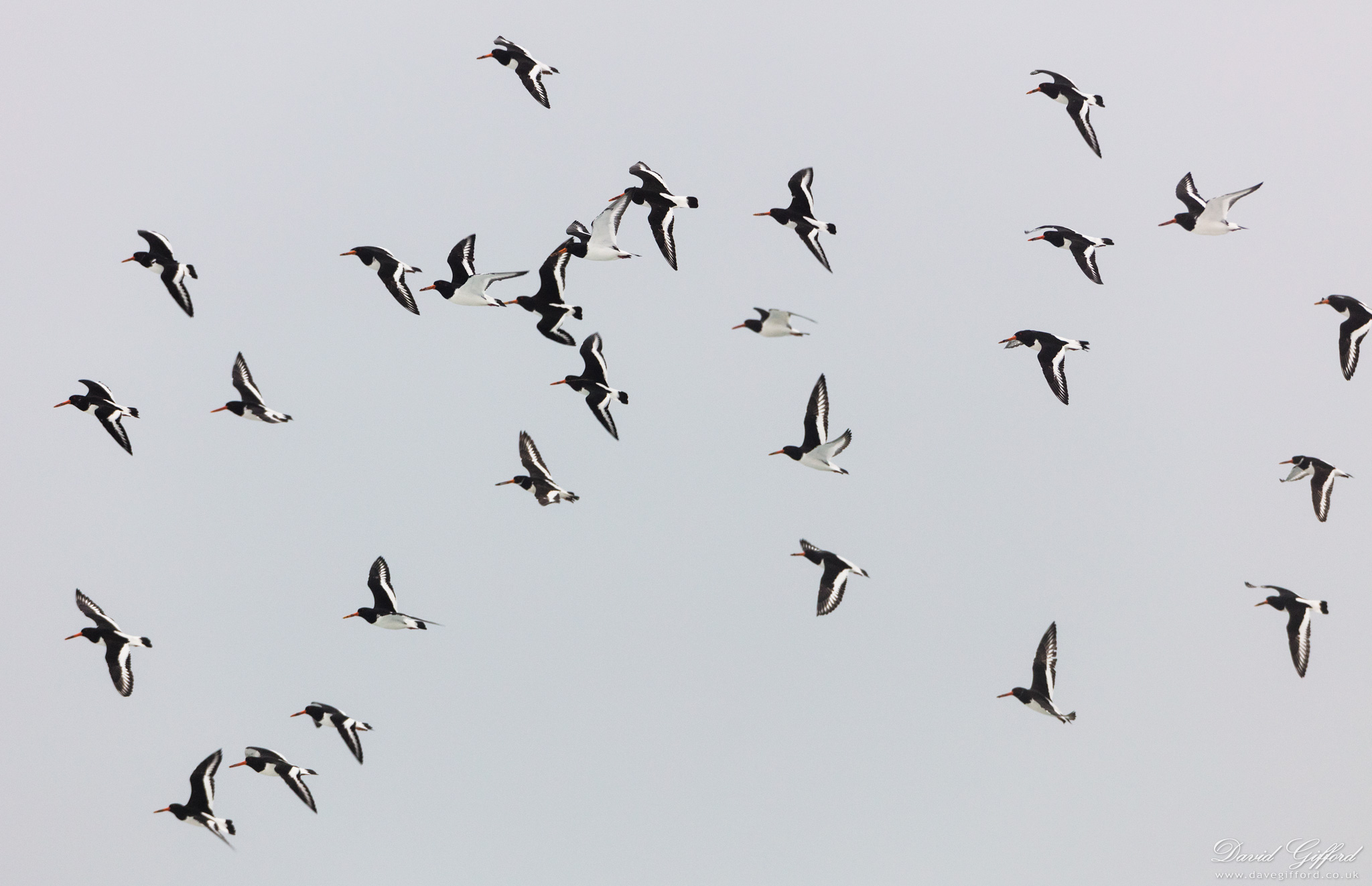 A flock of Oystercatchers, known in Shetland as Shalders, photographed mid-February as they return following their winter migration.
