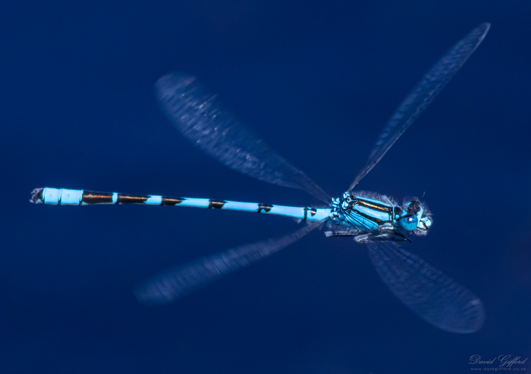 A close-up photo of a Common Blue Damselfly photographed flying over a lochan in Shetland. They measure only 29mm to 36mm in length. One of my favourite species to see in Shetland.