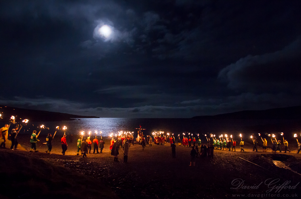 An atmospheric location for the galley burning of the South Mainland Up Helly Aa 2014, which was at the Gulberwick beach this evening. After a day of strong wind and rain, the weather improved, and the moon nicely lit up the bay.