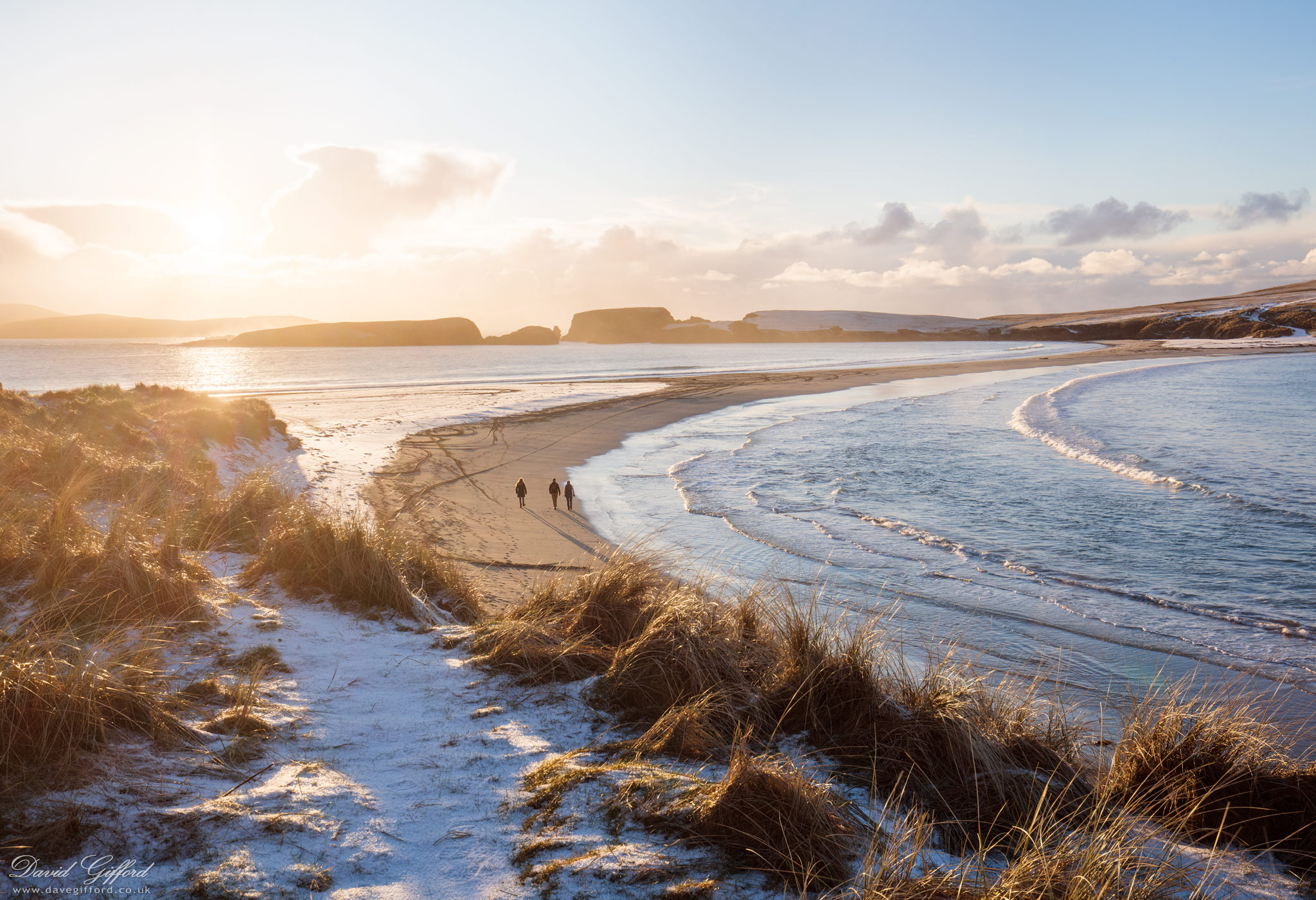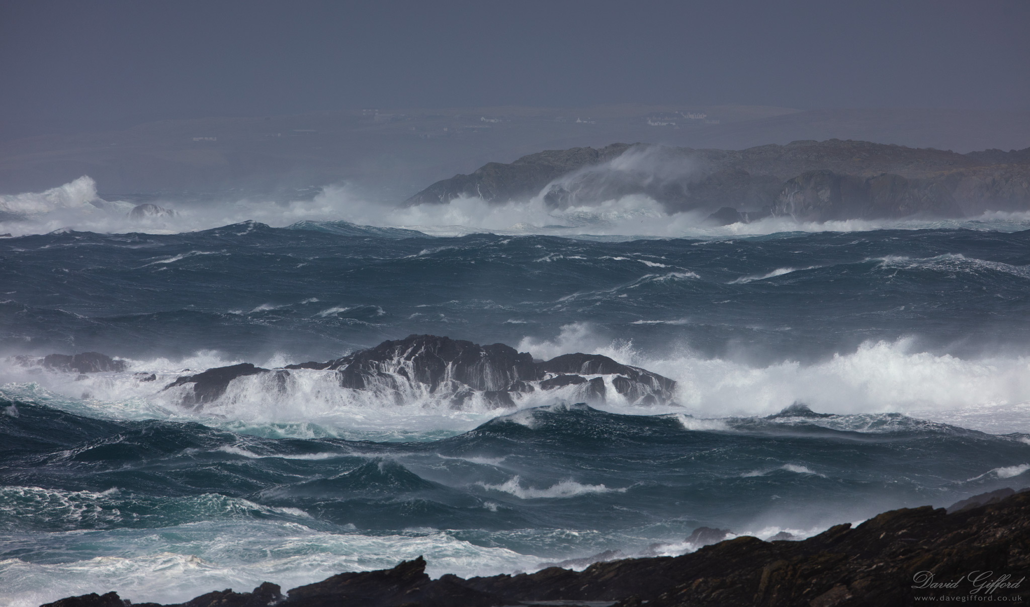 A stormy view looking across the sea to the island of Oxna and the village of Skeld in the distance. Photographed safely out the car window.