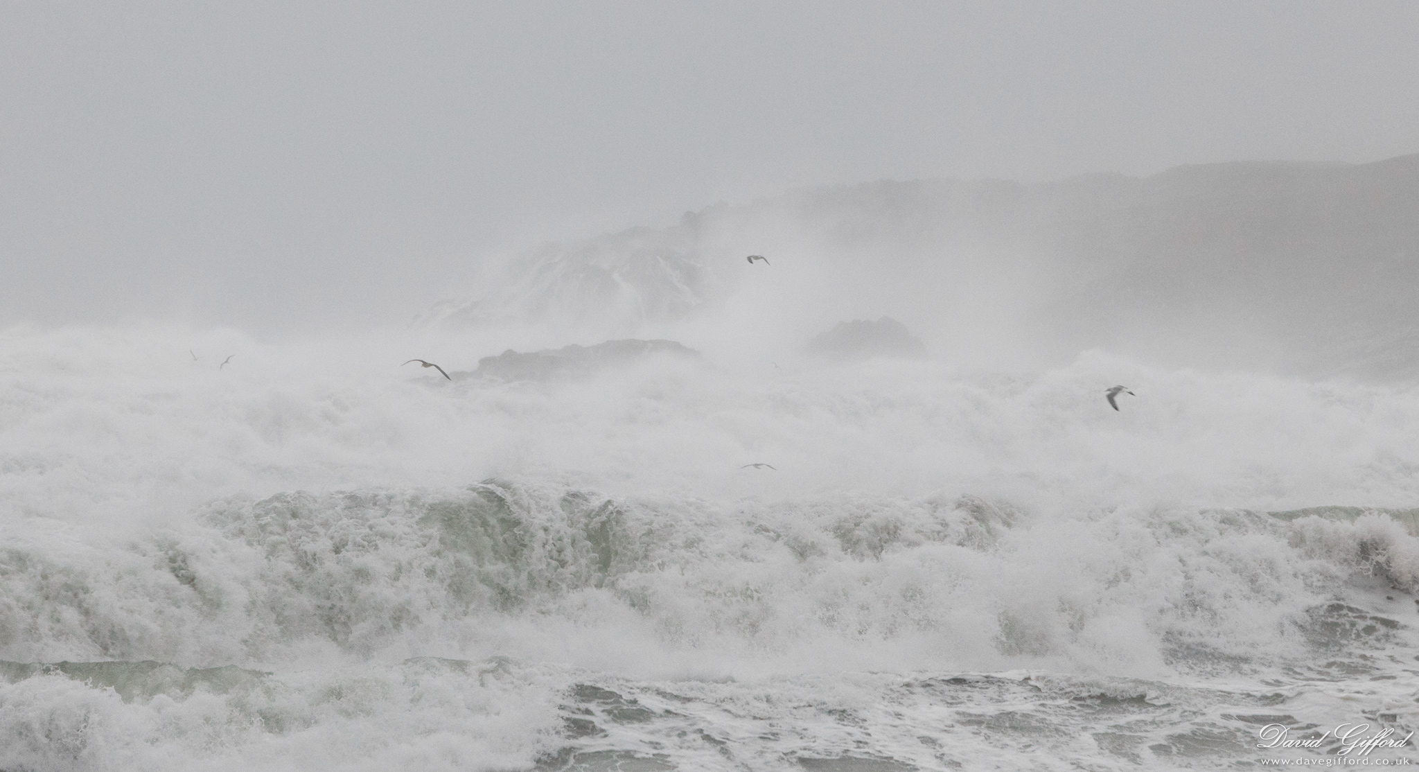 Huge quantities of spray along the coastline during storm Deirdre. The gulls, battling the strong winds, look for washed-up fish.
