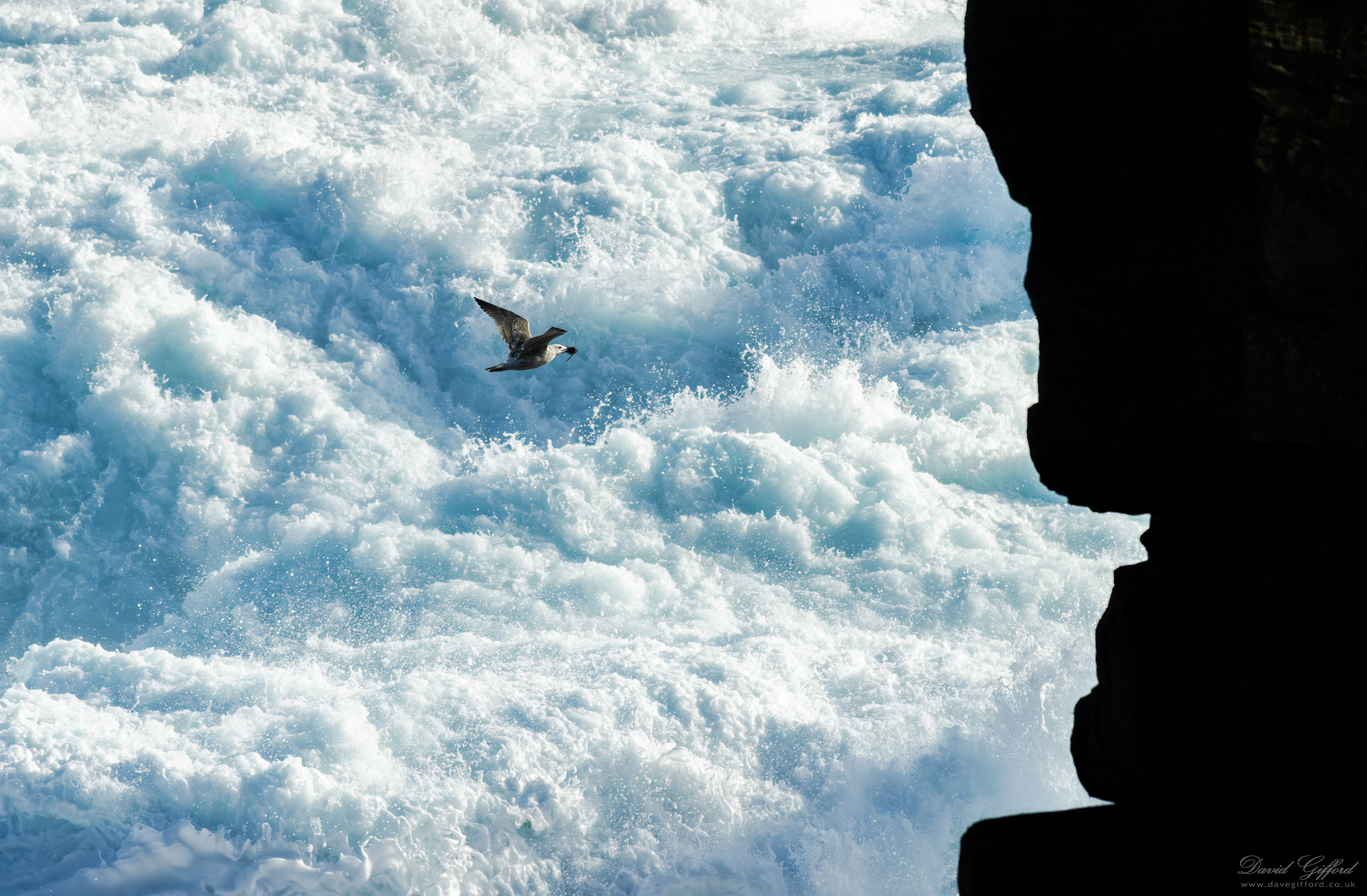 Storm Scarf A scarf in flight silhouetted against crashing waves.Posted: November 5th, 2023BirdScarfShetland♦Image #1321