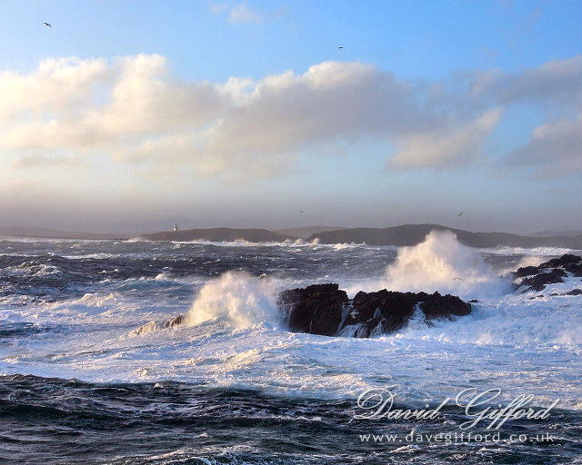 Shetland had several bad gales during the summer. This photo was taken during one of them at Sandwick in Burra. Waves crashed into the headland known as the Alter, whilst in the distance Hamnavoe lighthouse caught the sunlight.