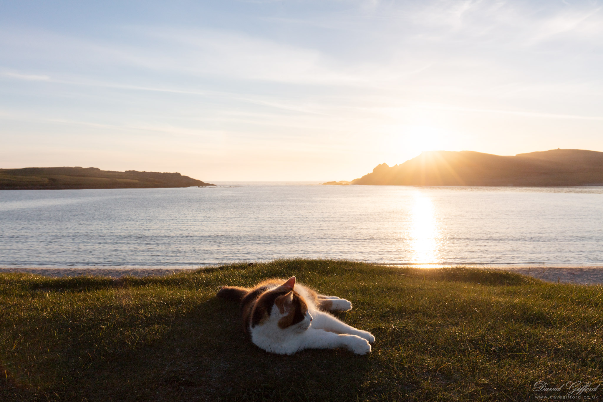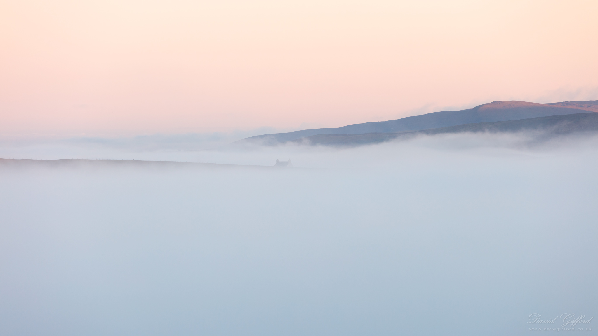 A single house visible above the mist rolling in from the sea, obscuring the houses in Gulberwick.