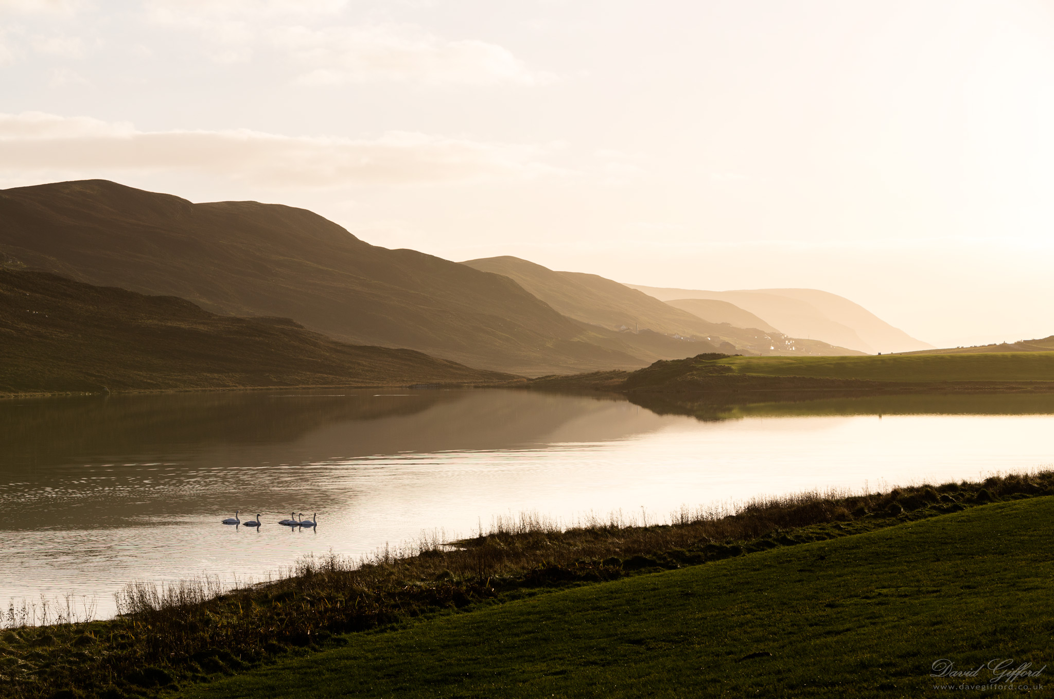 A photo looking across the south end of Tingwall loch, and part of the Astra golf course, towards Scalloway.