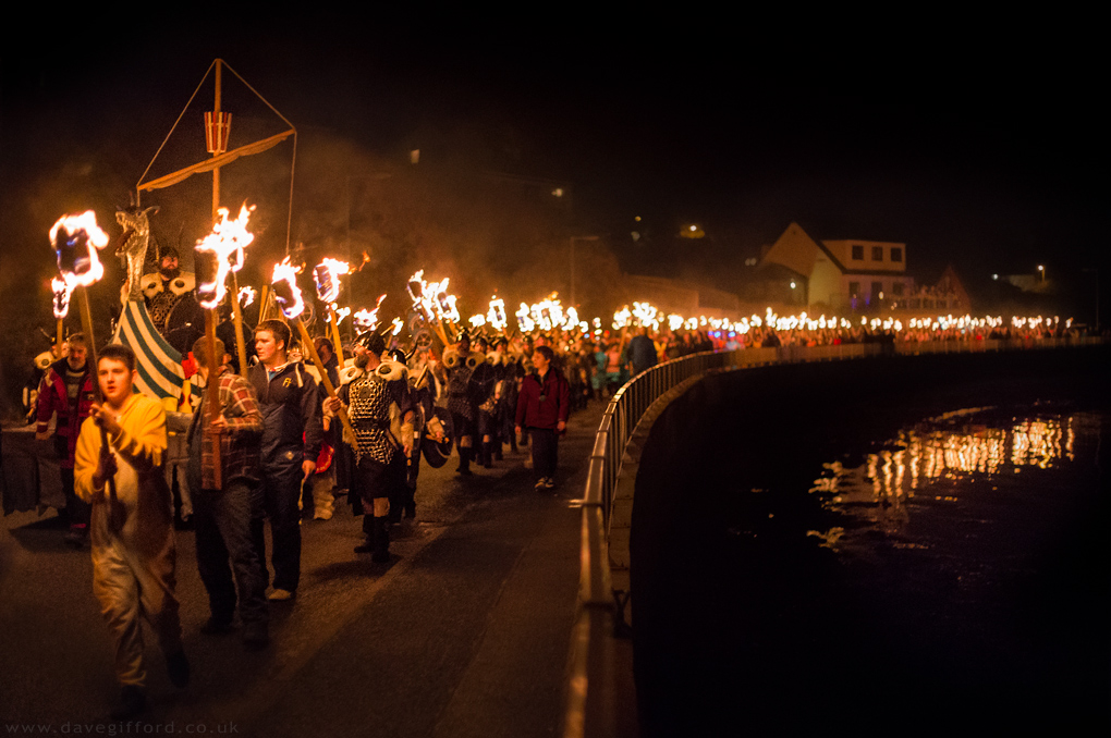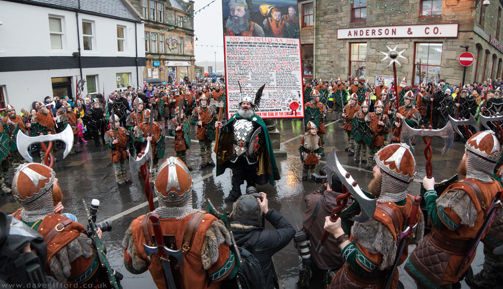 Guizer Jarl Neil Robertson surrounded by his squad and onlookers at the Market Cross in Lerwick this morning. Some light rain but not dampening the atmosphere.