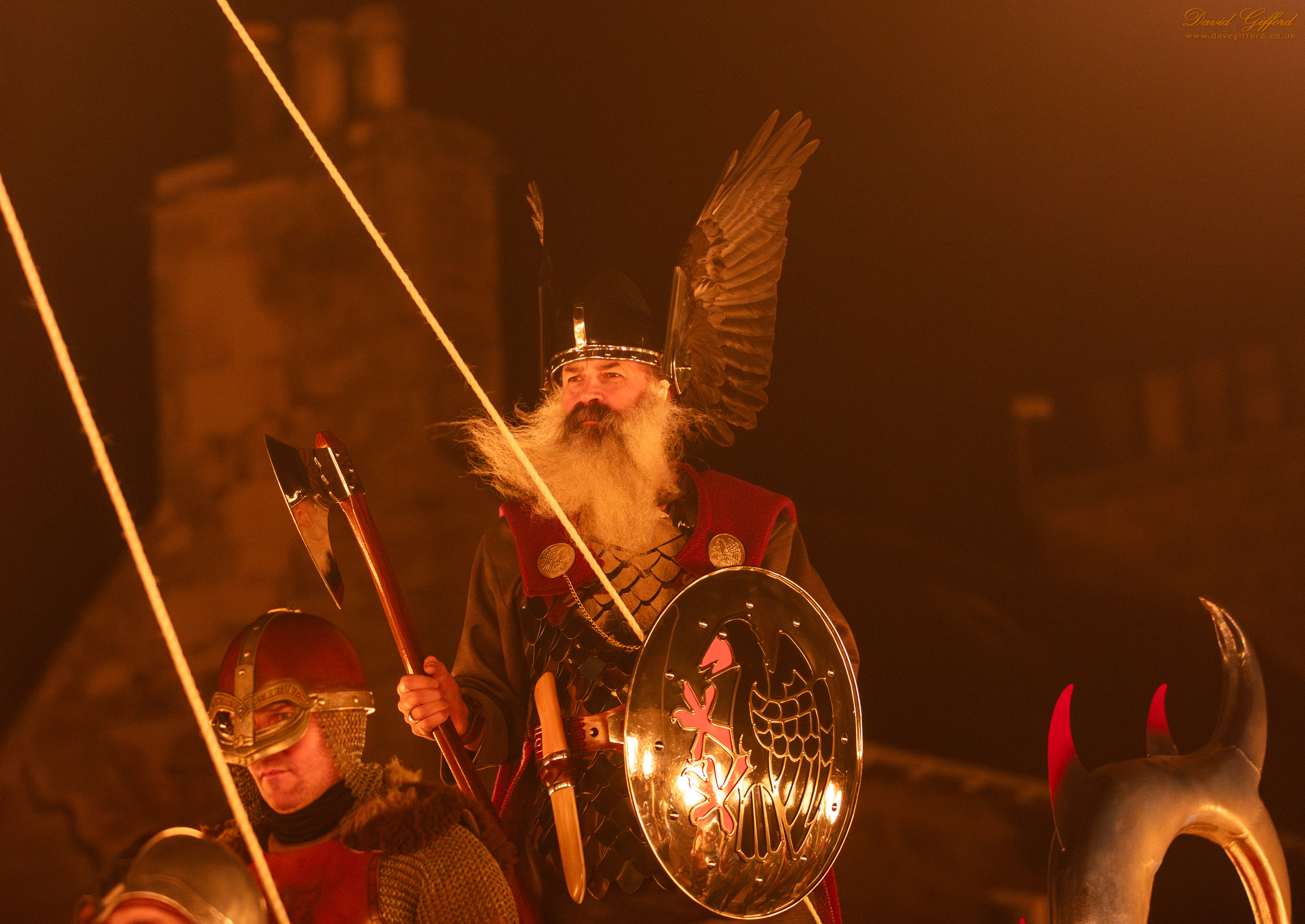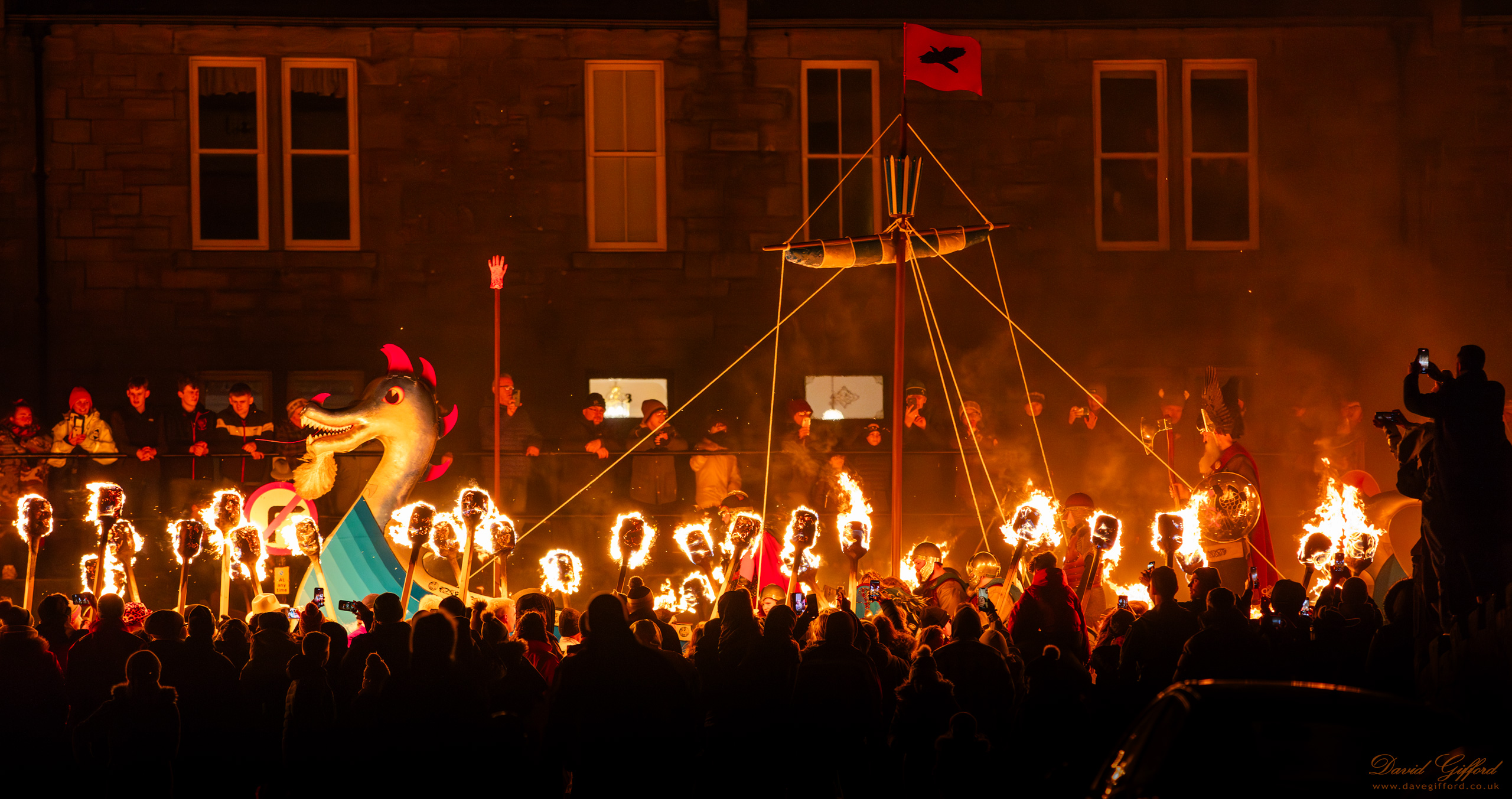 The long procession of torch carrying guizers make their way through the darkened streets.