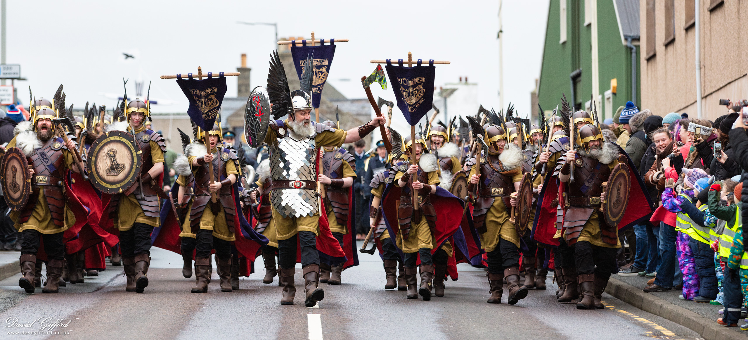 The Jarl Squad marching through the streets of Lerwick during the morning procession, delighting children and adults, both local and visitors.
